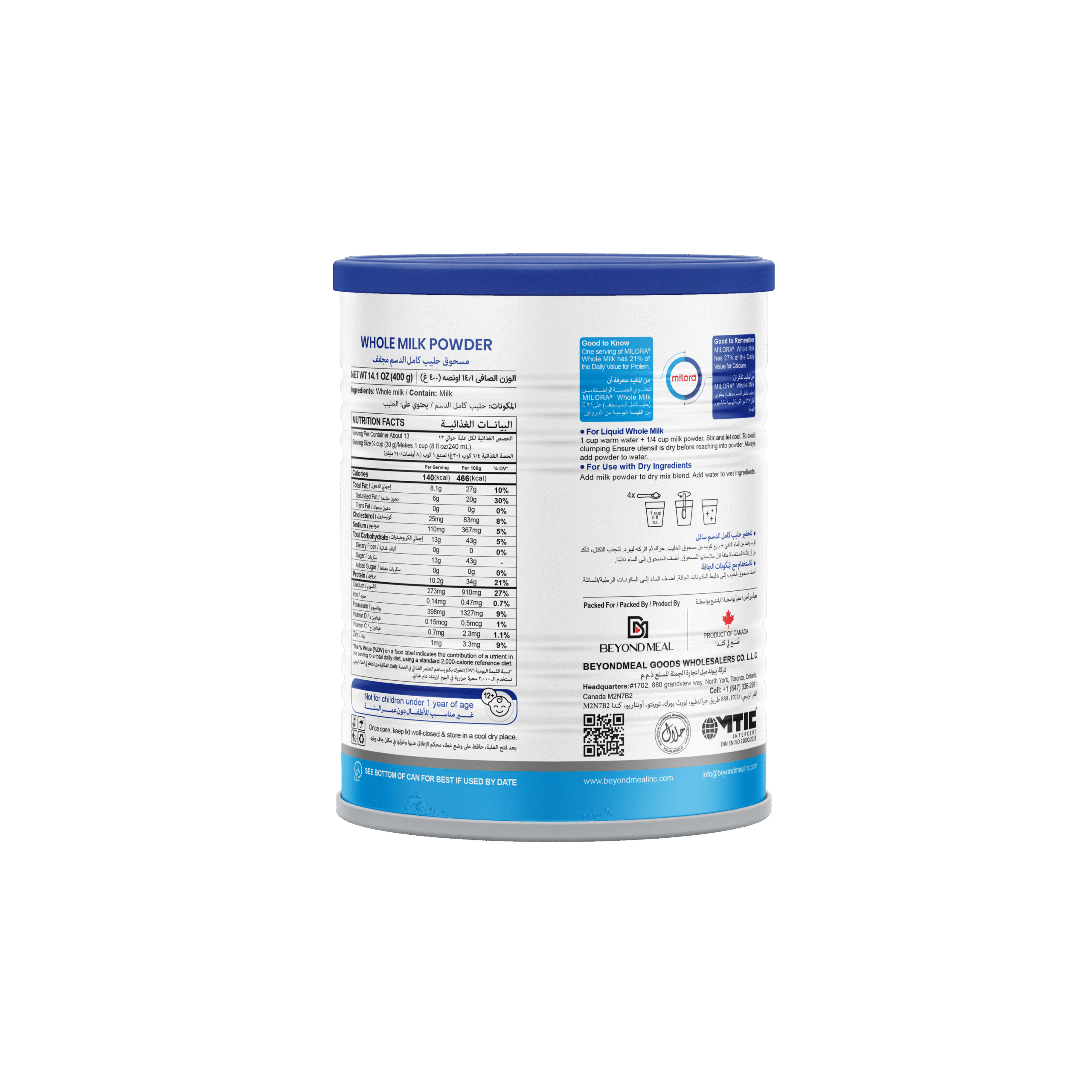 Milora Whole Milk Powder is a premium spray-dried dairy ingredient made from fresh, pasteurized whole milk. It delivers a rich, creamy taste and smooth texture while preserving the natural goodness of milk. With balanced fat and protein levels, it ensures excellent solubility, functionality, and consistent quality under strict HACCP standards in Canada.